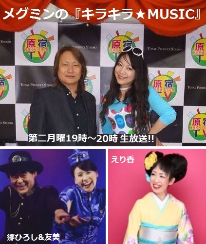 5/9(月)OPEN 18:45 START 19:00~20:00 O.A 生放送!!ご視聴&ご来場お待ちしてま~す♪ 原めぐみがお送りする音楽番組♪ 5月からは昭和アイドル評論家のゆもさんをMCに迎え、ゲストには、只今「お弁当箱の歌」がブレイク中の【郷ひろし&友美】さん、日本料理屋の女将で演歌歌手の【えり香】さんをお迎えしてお送りいたします。
